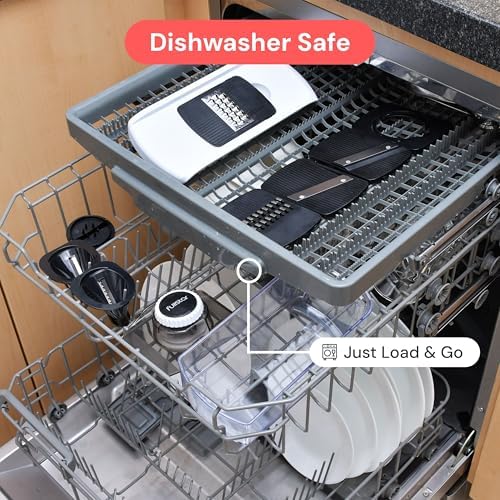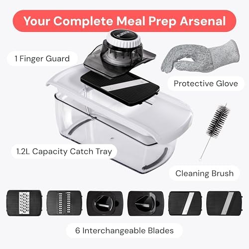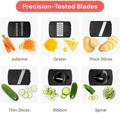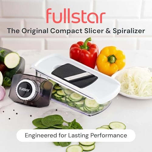 About this item Greatest Functionality on the Market – This 5-cup, large-capacity mandoline slicer features 6 interchangeable blades to meet all your slicing, grating, and spiralizing needs. Create zoodles, vegetable pastas, and beautiful garnishes with ease — a useful gift and one of the most versatile kitchen gadgets for healthy meal prep. Compact and Dishwasher Safe – Designed for easy disassembly and quick storage, this vegetable slicer keeps your kitchen organized and cleanup simple. Dishwasher-safe with a specialized cleaning tool to remove residue, it’s a thoughtful practical gift and time-saving cooking gift for busy home chefs. Keeping You and Your Family Safe – Our high-quality stainless steel blades are razor sharp, so we’ve included a protective glove and fingerguard for safe slicing every time. Made from BPA-free, nontoxic ABS plastic for healthy cooking. A smart home gift or house warming gift that combines safety, style, and durability. No Mess and No Slips – The built-in catch tray keeps counters tidy, while the non-slip base provides stability for smoother slicing and grating. Cleanup is effortless — making this a perfect choice for white elephant gifts, kitchen gifts, or anyone who appreciates functional kitchen tools. The Perfect Kitchen Gift – Whether you’re a beginner or seasoned cook, the Fullstar Mandoline Slicer makes meal prep faster, cleaner, and more enjoyable. Ideal for low-carb, plant-based, and family meals, it’s one of the best gift ideas for holidays, Christmas cooking, or everyday use — a must-have among modern kitchen gadgets and cooking gifts